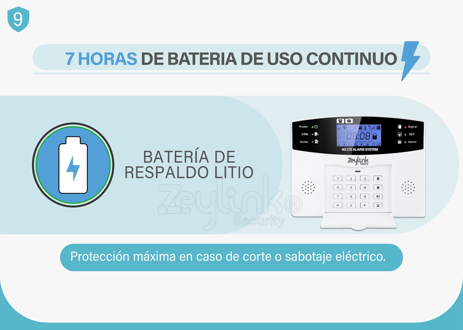 Gracias a su batería de Litio incorporada, podrás tener hasta 7 horas de respaldo en caso de corte o sabotaje eléctrico por intrusos.