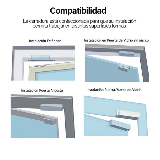 | Tipo de Instalación | Para puertas de Vidrio, madera, aluminio, metal. |