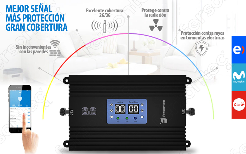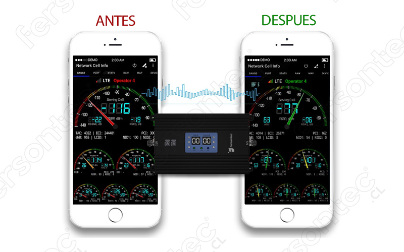Este profesional y poderoso Amplificador/Repetidor de señales de celular Dual-Band Entel, Claro y Movistar